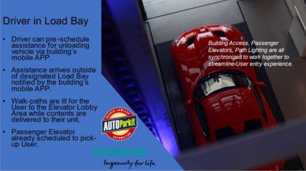 One of the latest installments of the IoT evolutions is the convergence of AUTOParkit an autonomous parking system with an autonomous building. This integration across a comprehensive open digital building architecture produces exciting outcomes that enhance the user experience. It starts with cars entering the building. AUTOParkit is the first integrated system that detects the vehicle via entry gate, VRFID (Vehicle RFID), LPR (License Plate Recognition), motion-activated cameras, ultrasonic sensors, or buried proximity sensors. After the vehicle is detected AUTOParkit directs the driver to an available Load Bay and alerts the building automation system. The early notification maximizes the time for the building to begin to react for access control, path lighting, passenger elevator, and diminishes the user's wait time for building services.