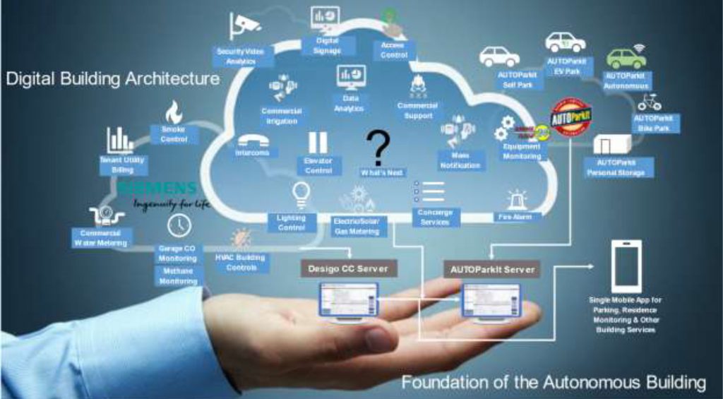 IoT allows a cloud-based platform, which integrates the architectural, structural, and MEP design into a common format that previously would have been working in independent silos. In the layout below, Autonomous Cars communicate with AUTOParkit connected with a Digital Building Infrastructure. This allows added functionality by interfacing with Autonomous Cars and new services such as Automated Valet Services (AVS).