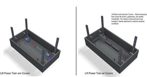 Lift Motor and Gearbox Cover – Steel enclosures that cover the lift motors, gearboxes, and partial driveshafts. The interior of the enclosure has insulation sheets attached for extreme weather conditions.